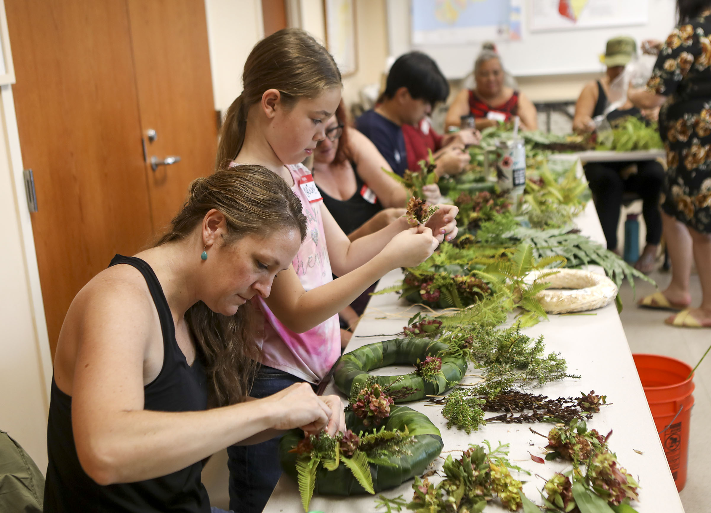 Lindsey and Olive Duggan make wreaths out of native plants together during a workshop with the Big Island Invasive Species Committee in Nov. 23, 2023. (File photo: Kelsey Walling)