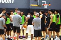 The Colorado men’s basketball team huddles at center court after an offseason practice on Monday, July 21, 2025 at the CU Events Center in Boulder.