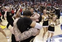 Colorado’s Nate Tomlinson, right, and teammate Carlon Brown celebrate their team’s 53-51 win over Arizona in the finals of the Pac-12 conference championship in Los Angeles on March 10, 2012.