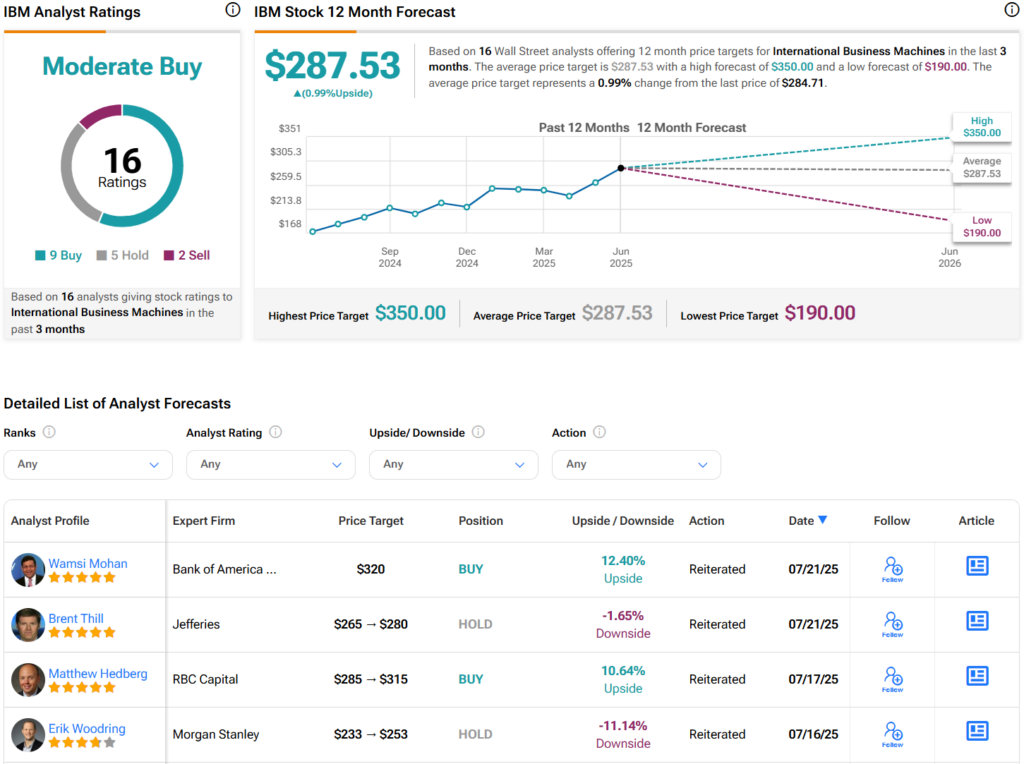 Turning to Wall Street, analysts have a Moderate Buy consensus rating on IBM stock based on nine Buys, five Holds, and two Sells assigned in the past three months, as indicated by the graphic below. Furthermore, the average IBM price target of $287.53 per share implies 1% upside potential.