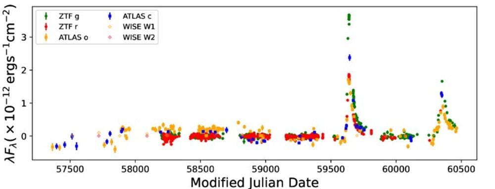 This figure from the research letter shows optical and ultraviolet light curves for AT 2022dbl from multiple astronomical surveys. It shows both detected flares, which are very similar to each other in the optical bands and show some differences in the ultraviolet. No earlier flares were detected in the ∼1500 days preceding the first flare. Image Credit: Lydia Makrygianni et al 2025 ApJL 987 L20