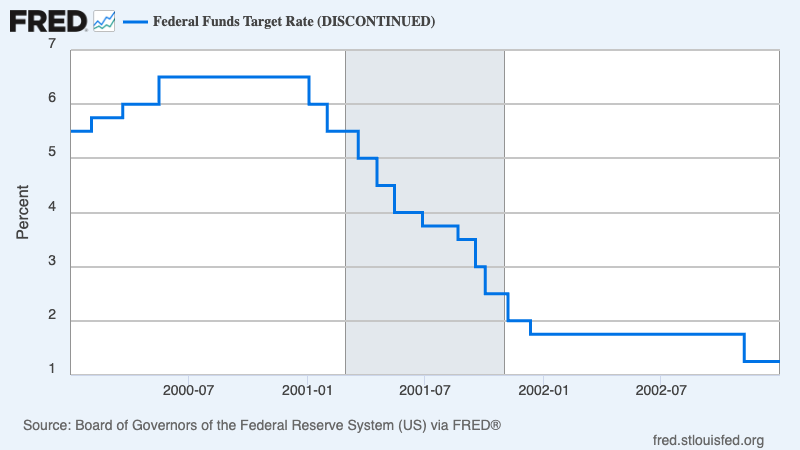 Indeed, the graph below shows the numerous rate cuts as the tech bubble burst: