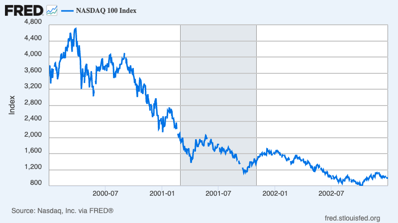 Some of us have seen this movie before. For those who haven’t, there is a pervasive view that the deflation of the 90s tech bubble was something that happened all at once — a Wile E. Coyote moment in which investors looked down, realized that there was nothing supporting those high valuations, and the market plunged. In reality, however, it was a long, drawn-out process, punctuated with some significant dead cat bounces along the way. Here’s the Nasdaq 100 over the relevant period (the gray bar represents the 2001 recession):
