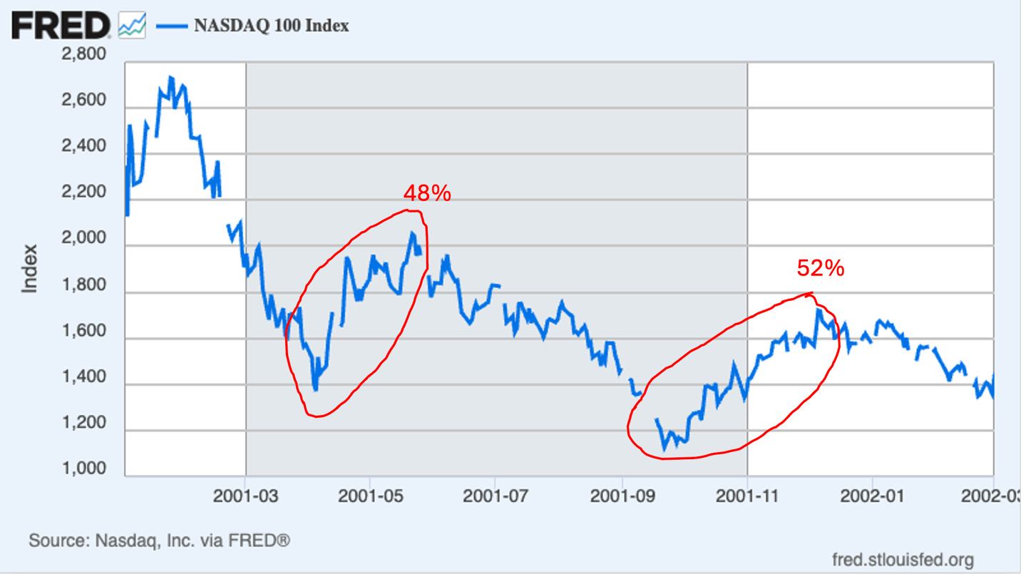 Measured against the awesome scale of the ultimate tech-stock decline, the temporary rallies along the way don’t look that big. But they were actually huge compared with normal stock movements. Let’s look at a closeup: