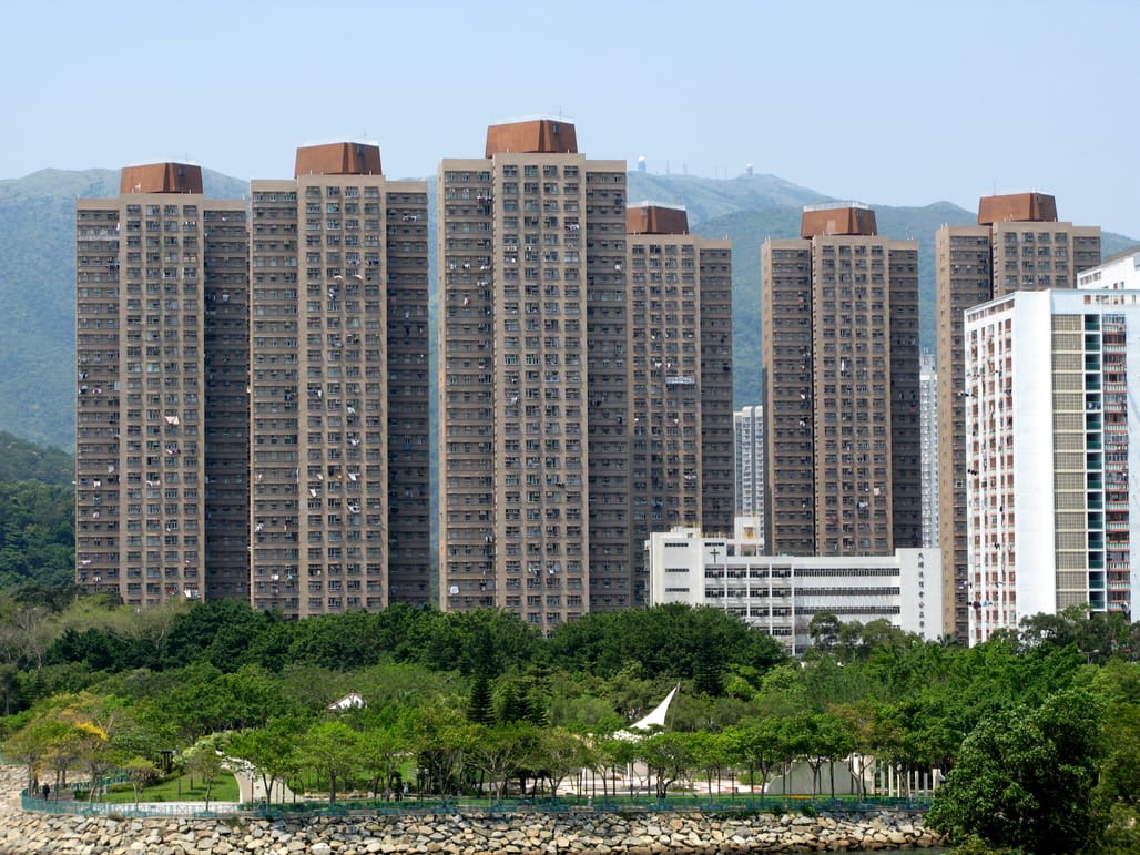 The Wang Fuk Court complex was constructed in 1983, comprising eight residential towers each rising 31 levels. The scheme is located in Tai Po, a residential district in northern Hong Kong, close to the city of Shenzhen. In total, the complex contains 1,984 apartments housing over 4,600 residents. Approximately 40% of the residents are aged 65 or over.