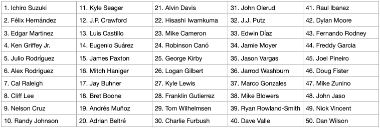 I took a liberal view of “greatest.” I wrote down about 100 names and ordered them without looking at their stats. I balanced performance, fidelity, entertainment value and whether the Mariners ever gave me free merch with their likeness as a child.