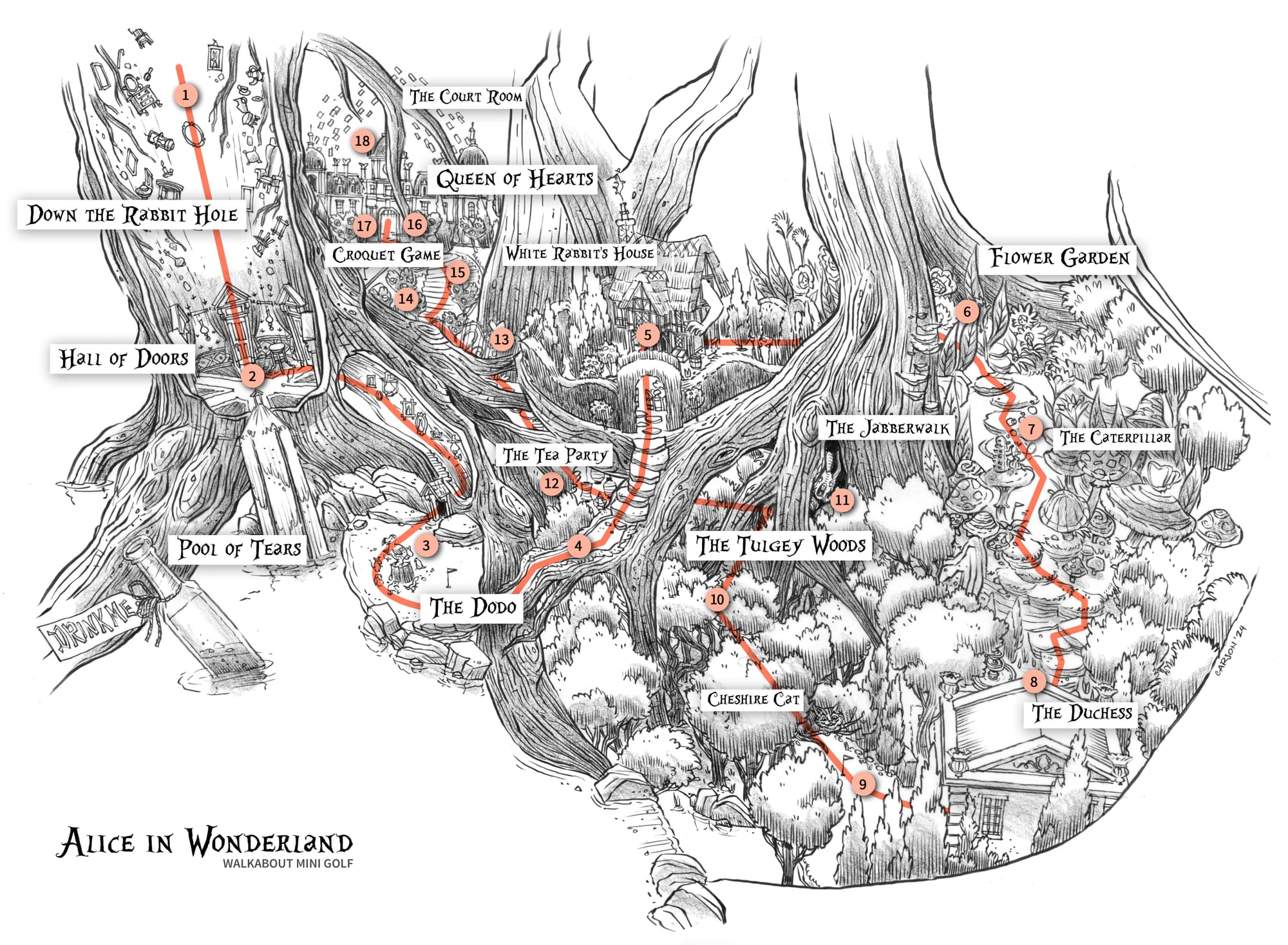 When he was a child, Carson loved Alice’s Adventures in Wonderland by Lewis Carroll with illustrations by John Tenniel. First published in 1865, Alice’s series of encounters with strange creatures has seen every kind of adaptation from those original words and images. From release on December 4, 2025, Carson’s course design for Martell’s Walkabout with holes by Henning Koczy will see people leaning in to look through the keyhole at a royal garden beyond. Then they’ll follow Alice’s trail of dropped bottles, growing small and large along the way in a mad laughing party of their own.