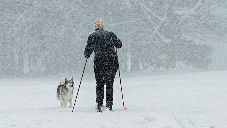 A cross-country skier is met by a dog during their journey in fresh snow at Capital Hills at Albany during the region’s first significant snowstorm on Tuesday, Dec. 2, 2025, in Albany, N.Y. (Lori Van Buren/Albany Times Union via Getty Images)