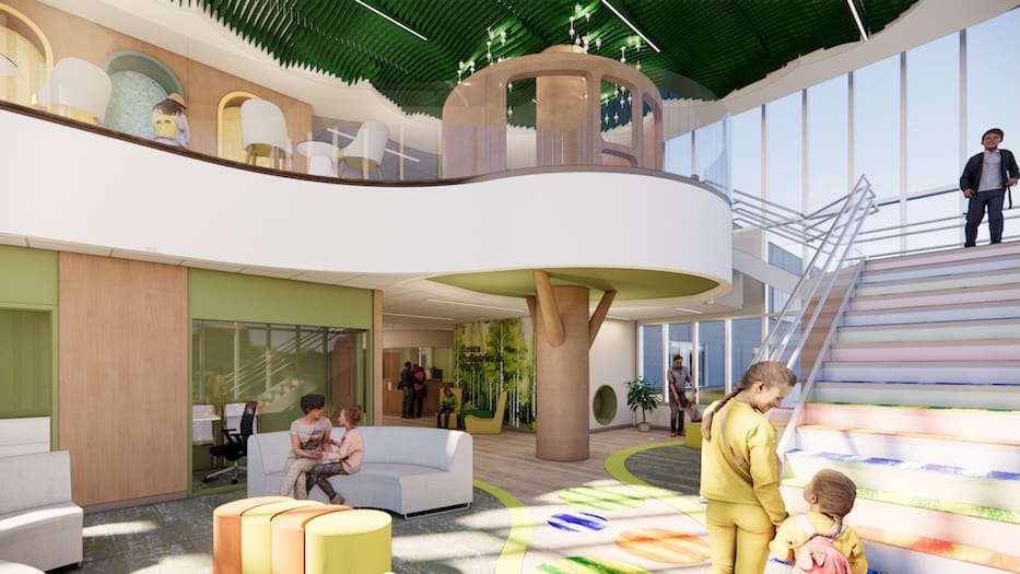 A two-story children’s play area dubbed “the treehouse” will include climbing and soft-play features along with stairs that change color when used. It’s available to both patients and visiting children and will be complemented by activity rooms designed for different ages.