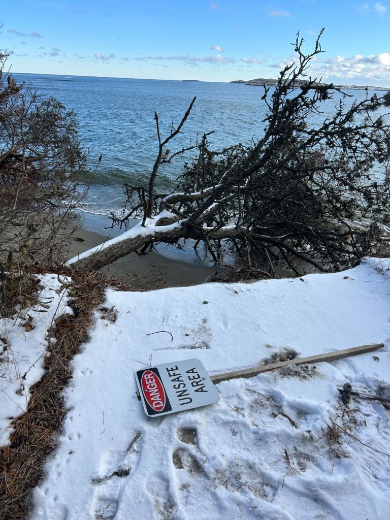 The trees likely helped prevent the recent erosion event from destroying even more dunes. About 30–40 feet of dune remained on the West Beach in early December, with many pine trees still buried deep under sand, snow and vegetation. The rest of the trees have probably floated away, Vaillancourt and Slovinsky said.