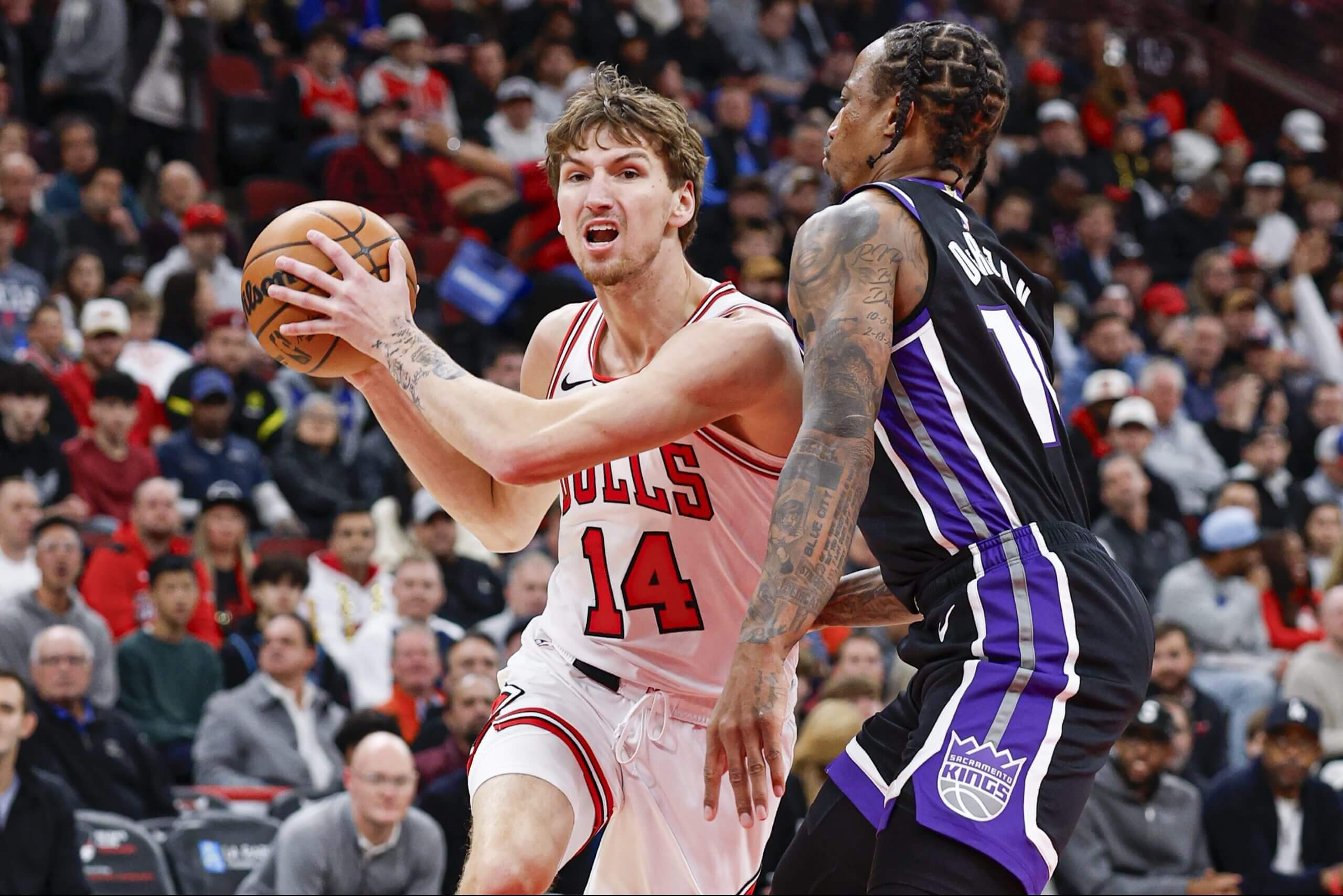 Matas Buzelis (14) is a scoring threat for the Chicago Bulls and often draws tougher defenders, including DeMar DeRozan from the Sacramento Kings. (Kamil Krzaczynski / Imagn Images)