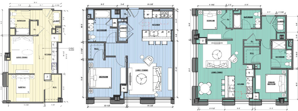 Studio (left) – 1bd (center) – 2bd (right) plans for Field Building by SCB