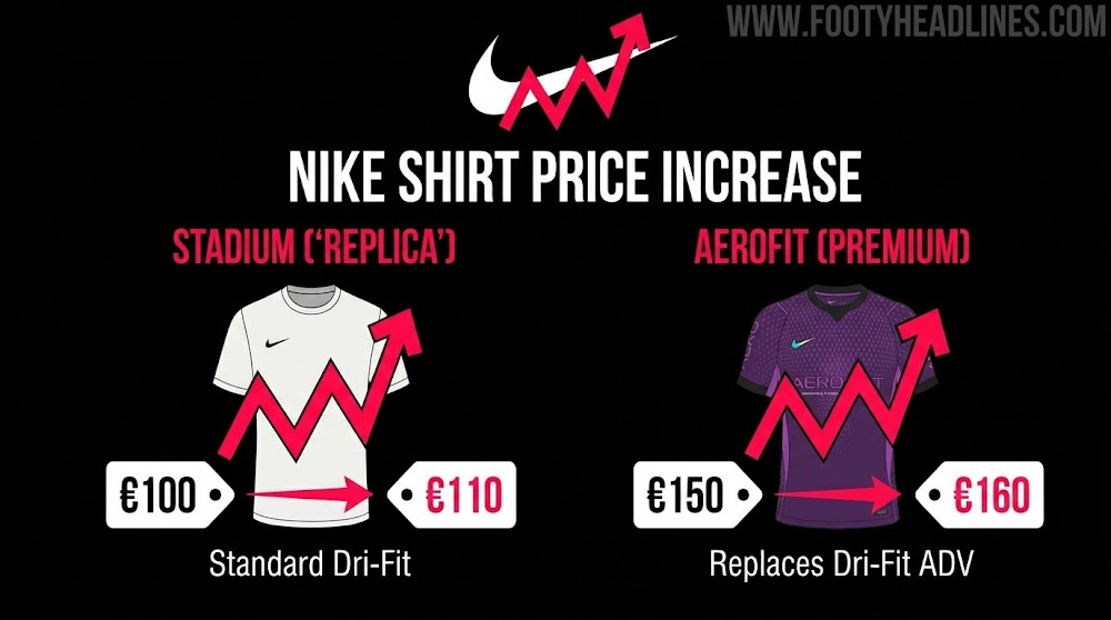 Price Increase: Nike will increase the prices of their football shirts starting in March, with replica shirts going from €100 to €110 and premium shirts going from €150 to €160.
