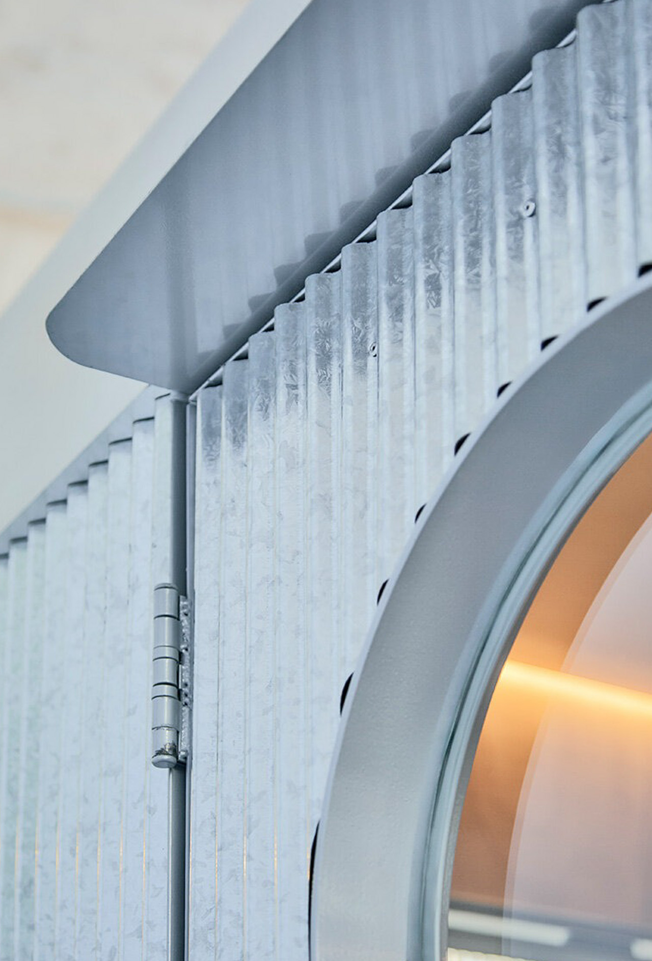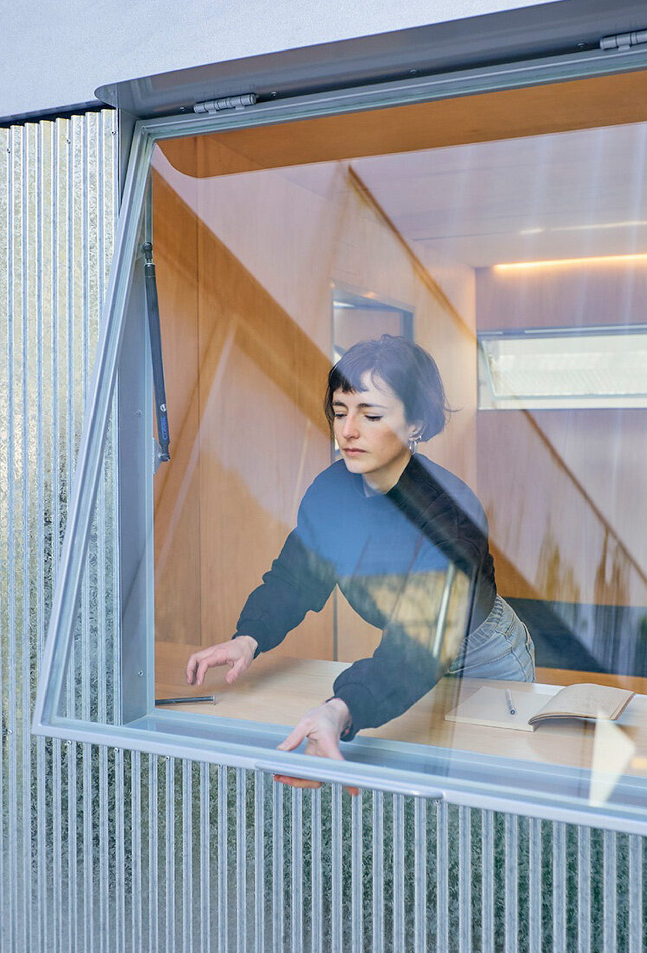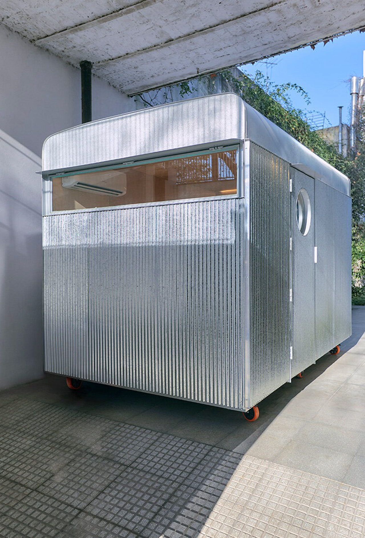 The design reads like architectural origami. Six prefabricated pieces arrive separately, then snap together within a single day using nothing more than a screwdriver and a riveter. Four detachable facade panels frame strategic openings for light and air. A curved roof caps the composition, channeling rainwater while nodding to the rounded profiles of Buenos Aires’ iconic buses. The wheeled base turns the entire volume into a vehicle of sorts, ready to relocate from backyard to rooftop, from residential plot to rural outpost.