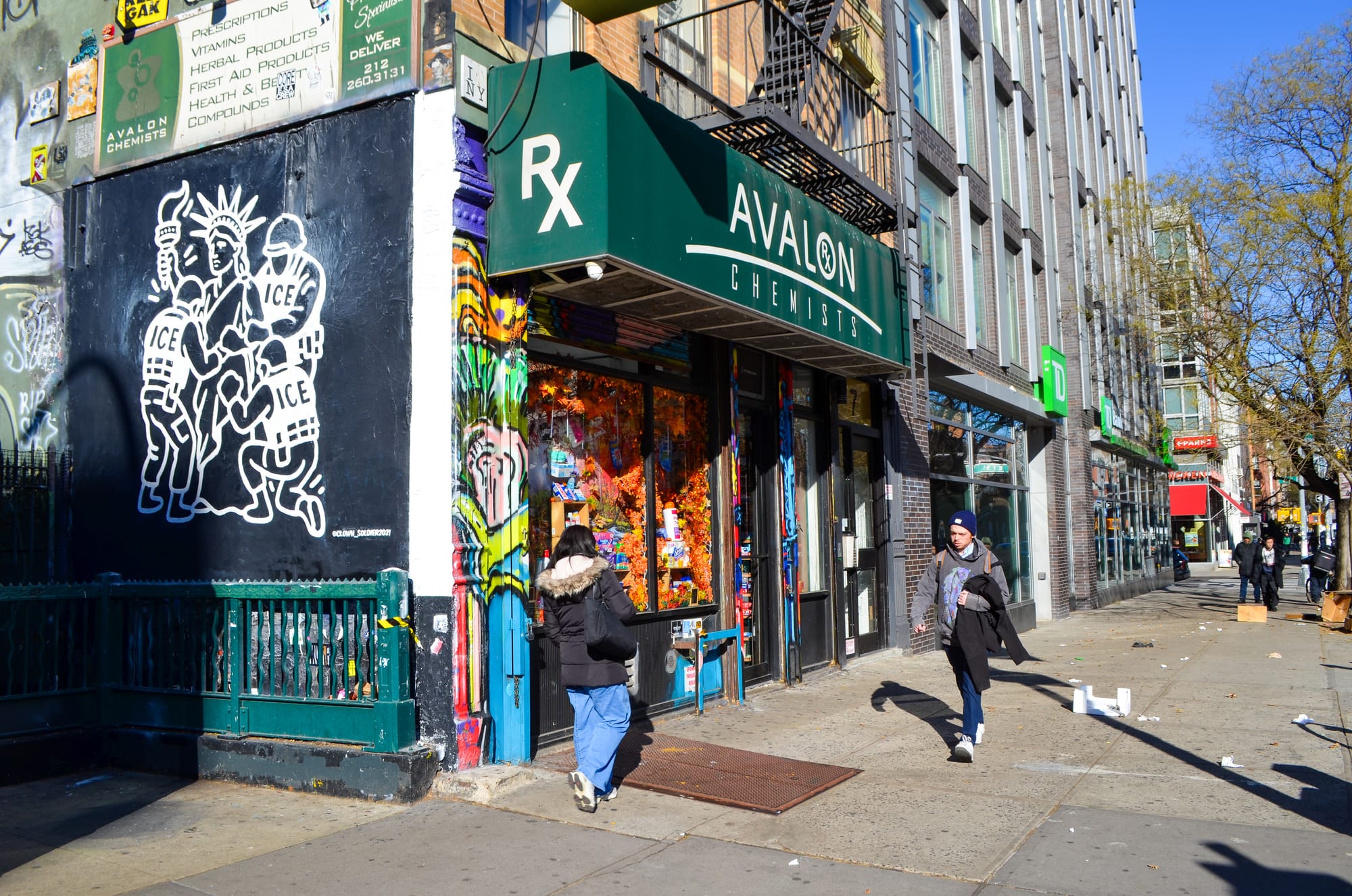 Longtime New York City street artist Doug Groupp, who uses the moniker Clown Soldier, created “Attack on Liberty” on November 26. The black and white spray-painted work binds immigration crackdowns to an erosion of civil liberties more broadly. Reached by Hyperallergic, Groupp said he was paid $120 to create the work, but declined to state by whom.
