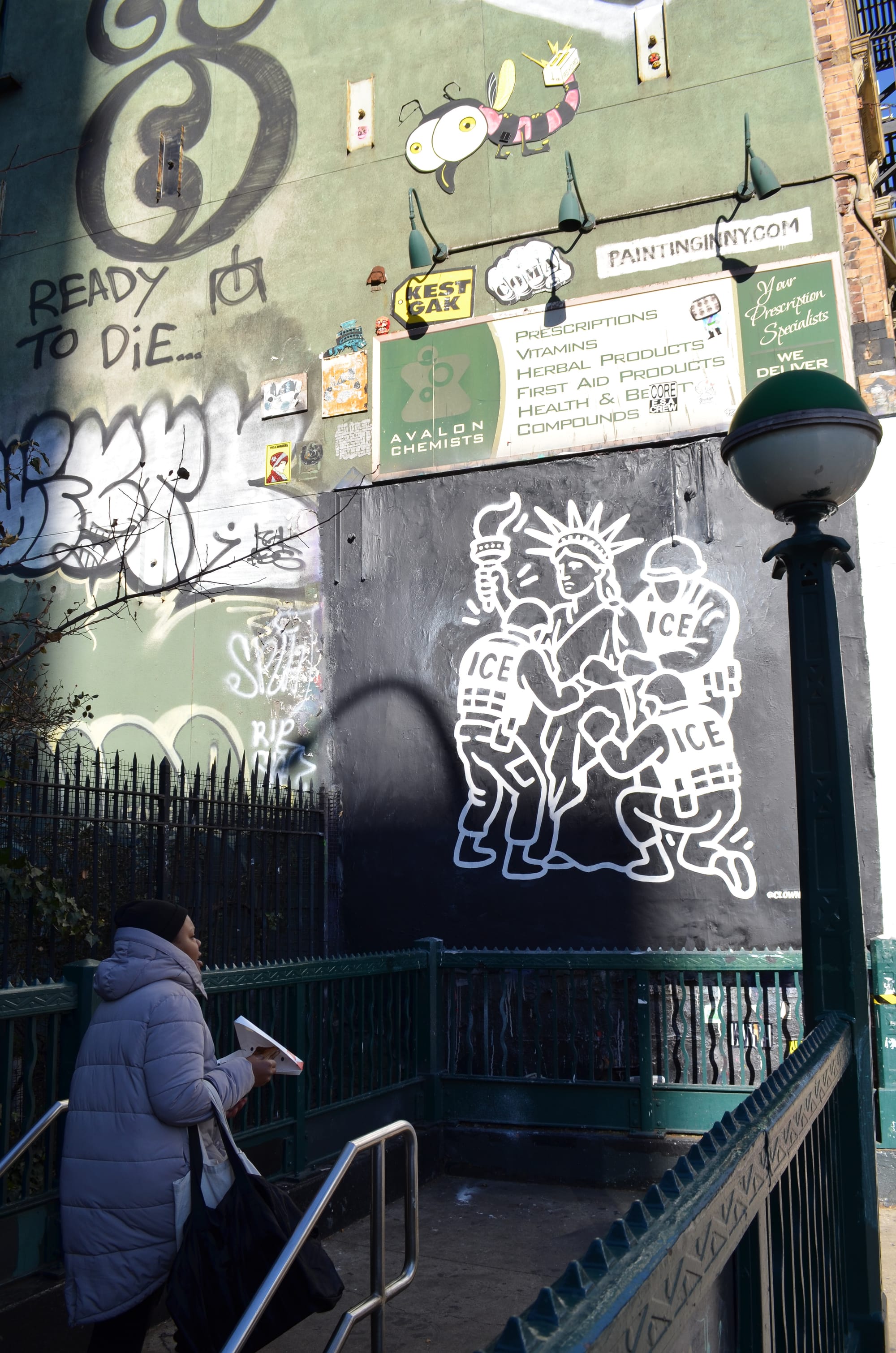 Outside an entrance to the Second Avenue subway station in Manhattan’s East Village, commuters and passersby are confronted with an artwork portraying Immigration and Customs Enforcement (ICE) officers detaining the Statue of Liberty.