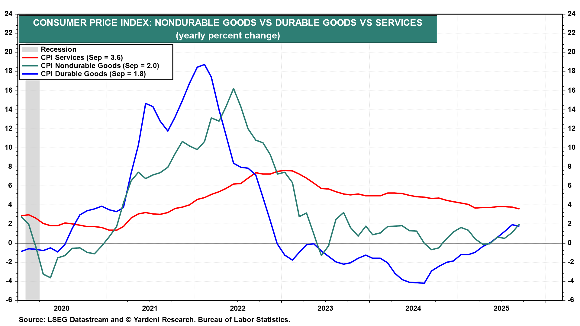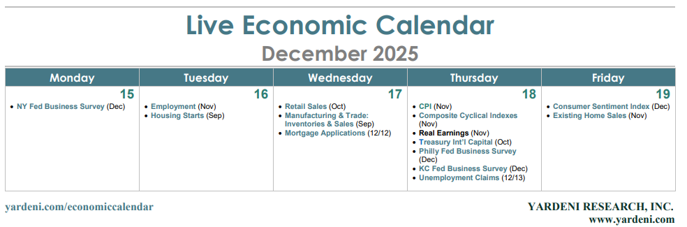 (2) CPI. October’s official CPI will remain forever MIA. November’s headline CPI (Thu) should be up 0.32% following a 0.18% increase in October, according to the Cleveland Fed’s Inflation Nowcasting. On a y/y basis, both remain stuck around 3.0%. Inflation would have been closer to 2.0% by now but for tariffs that boosted durable goods inflation (chart).