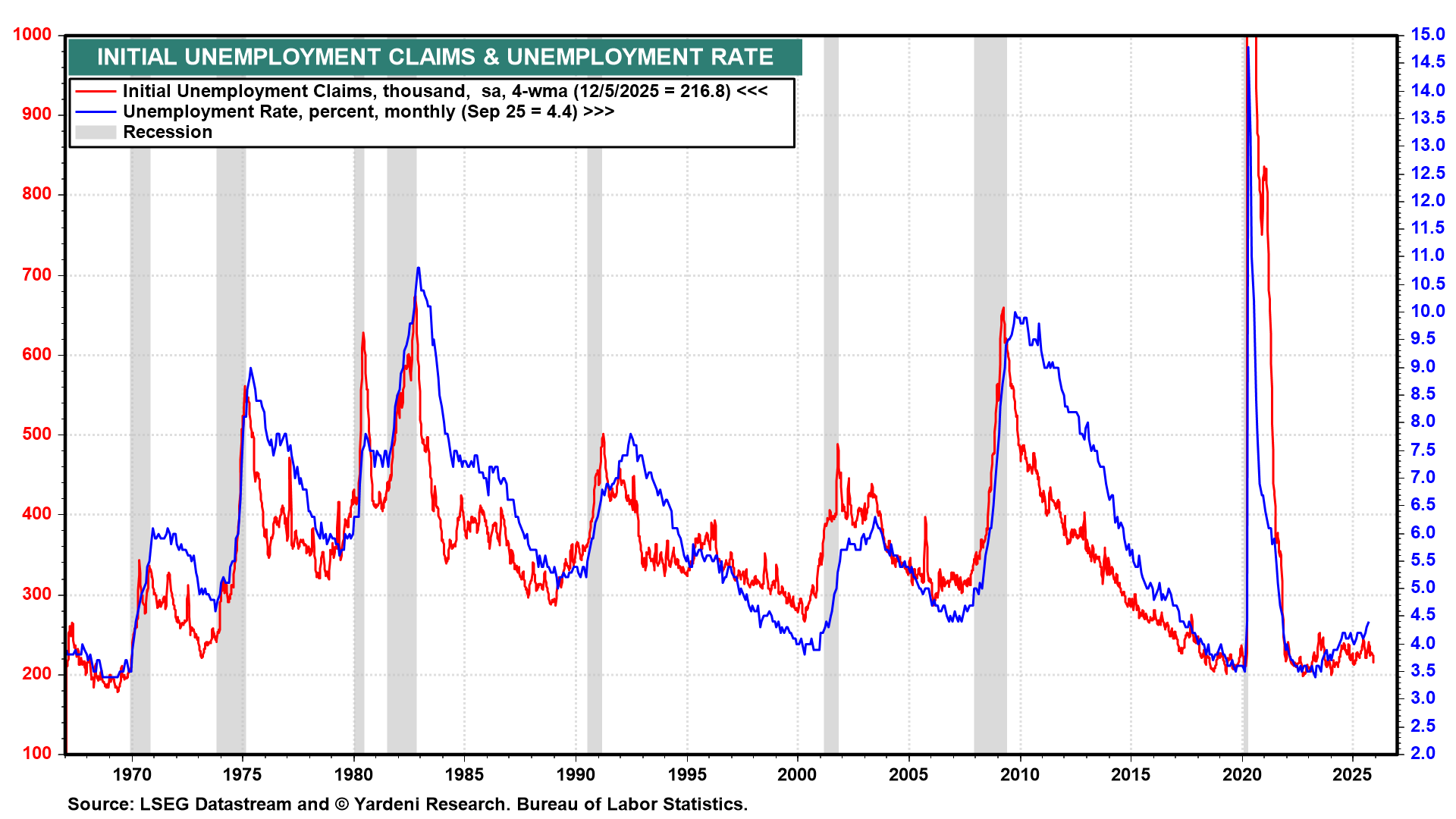 (1) Employment. The unemployment rate was 4.4% in September. October’s jobless rate will remain a permanent gap in the data. October’s payroll employment will be reported along with November’s reading (Tue). Markets looking for direction into year-end will scrutinize the payroll data for any hints that Powell might be onto something. We’re expecting a 40,000-job increase for both months. November’s jobless rate should hold steady at 4.4% given the low pace of initial unemployment claims (chart). The latest weekly jobless claims data (Thu) should confirm as much.