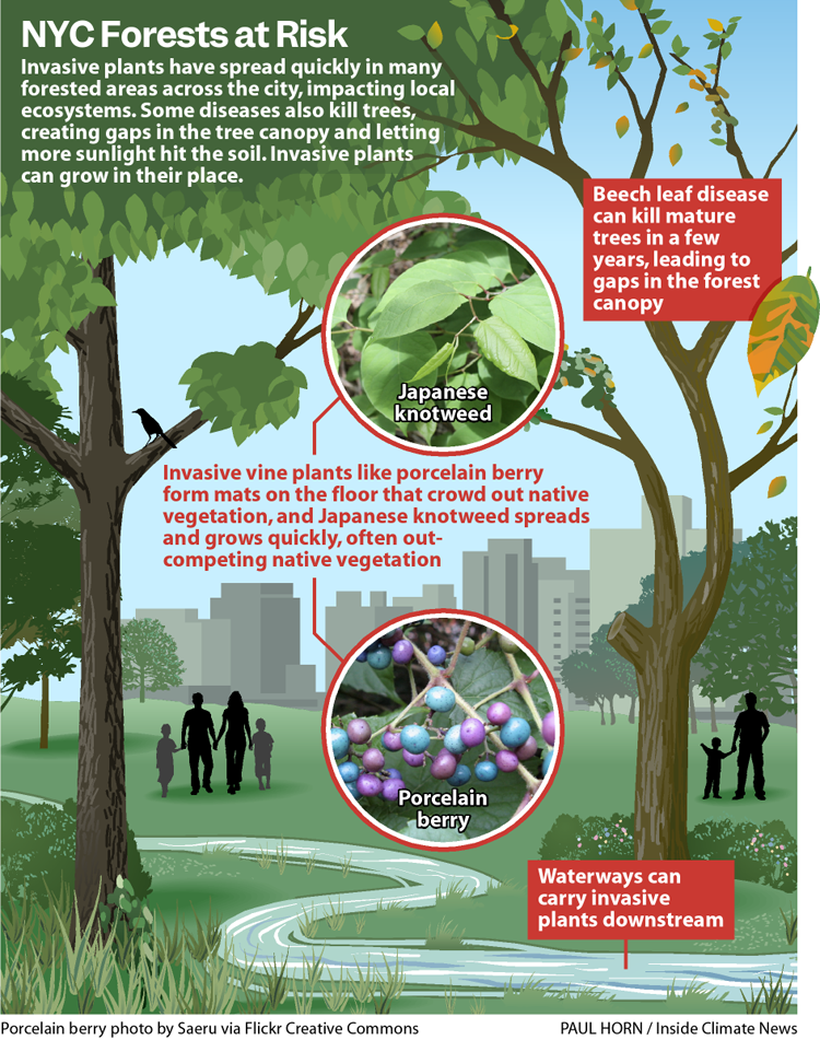 As Inside Climate News reported last summer, the city’s parks face significant challenges. At Bronx Park, it’s a “race against time,” said Murphy, as the invasive species spread, undoing decades of work to expel them. Invasive plants like knotweed and porcelain berry, which spread quickly, make it more difficult for native vegetation to survive.