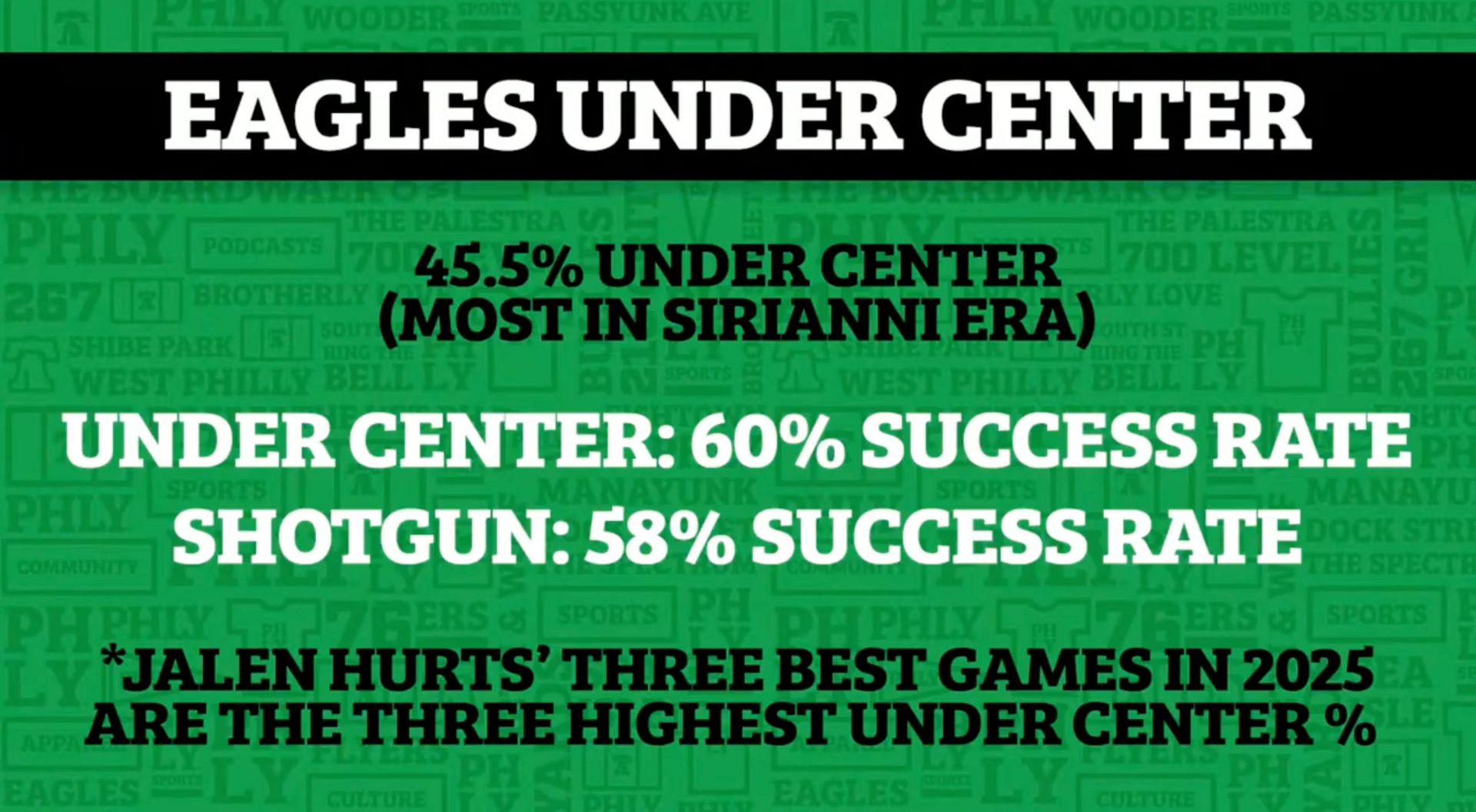The three times that Jalen Hurts was most under-center this season? His three best games of the year: at Minnesota, home against the Giants, home against Las Vegas. Again, not the greatest teams in the world, but maybe keep trying that until it does not work?