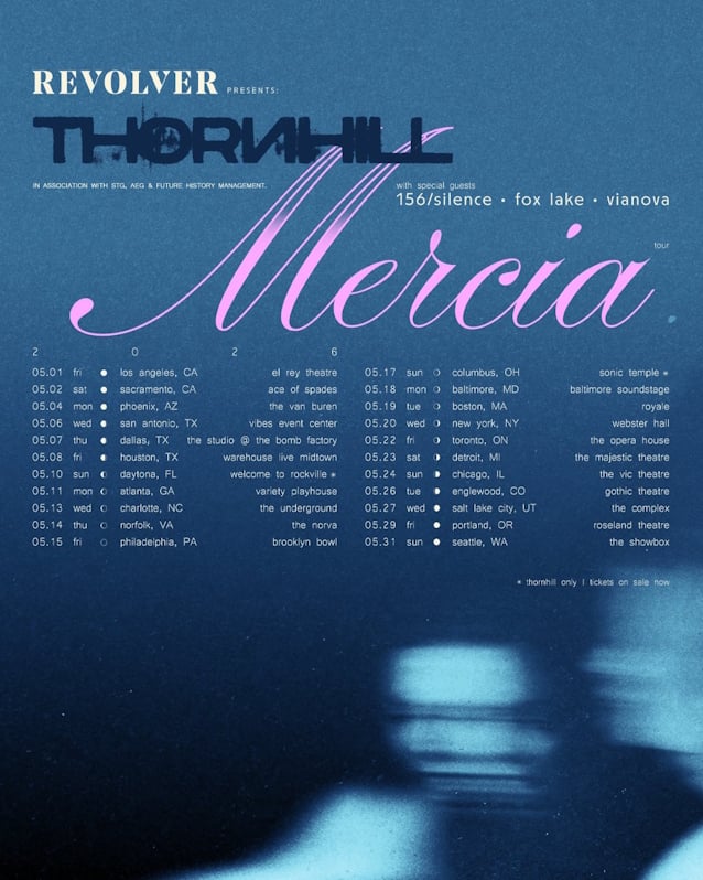 Australian alternative metal band THORNHILL will embark on a North American tour in May 2026. Support on the trek will come from 156/SILENCE, FOX LAKE and VIANOVA. The tour will kick off on May 1 at the El Rey Theatre in Los Angeles, California and will wrap up on May 31 at The Showbox in Seattle, Washington.