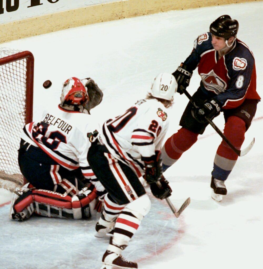 The Colorado Avalanche’s Sandis Ozolinsh (8) shoots the puck at Chicago Blackhawks goalie Ed Belfour as Gary Suter (20) defends during the second overtime period of Monday’s playoff game, May 13, 1996, in Chicago. Ozolinsh went on to score the game-winning goal on the rebound as the Avalanche beat the Blackhawks 4-3 to win the series 4-2. (AP Photo/Michael S. Green)