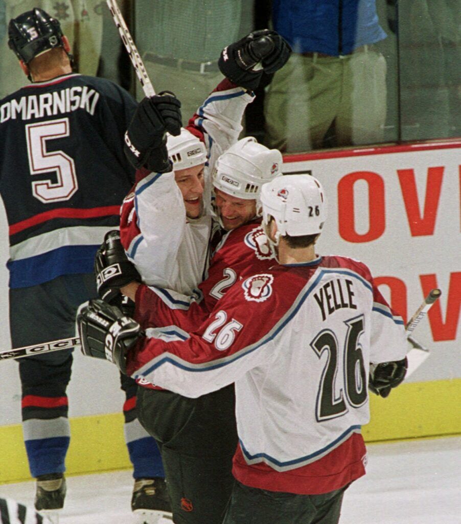 Colorado Avalanche defenseman Sandis Ozolinsh, left, is congratulated by defenseman Adam Foote after Ozolinsh scored his second goal in the first period in the first game of an NHL first-round playoff series against the Phoenix Coyotes in Denver’s Pepsi Center on Thursday, April 13, 2000. (AP Photo/Bryan Kelsen)