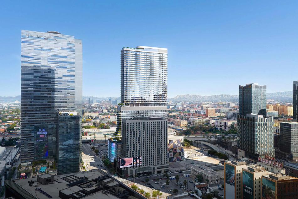 The project, which would replace a surface parking lot located at 917-931 W. Olympic Boulevard and 920-948 S. Georgia Street, calls for the construction of a 49-story tower. The building would include a 334-room hotel and 364 residential units on its upper floors, with restaurant space, a bar, meeting rooms, a ballroom, and a total of 112,593 square feet of entertainment uses. A total of 666 parking spaces would be built within the project.