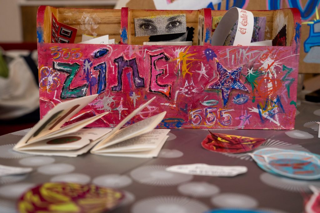 E displays her zines during the Espinas del Norte art show in Pilsen Sunday, Sept. 15 2025. Credit: Camilla Forte/Borderless Magazine/Catchlight Local/Report for America