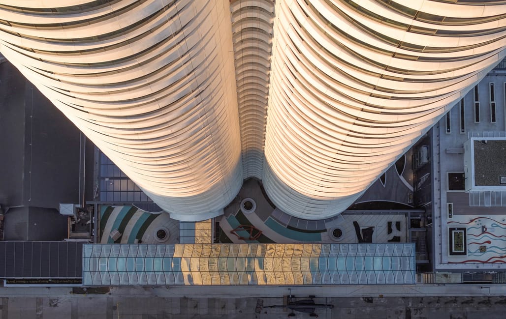 The tower’s form uses a split floorplate intended to draw daylight and air through the building via open-air breezeways on each level, with larger “sky gardens” occurring every third floor. The design includes a fifth-level, 50-metre lap pool enclosed by a glazed canopy supported by 36 prefabricated ribs. The tower envelope is described as an assembly of curved glazing and prefabricated glass fiber-reinforced concrete (GFRC) panels, organized in an A–B pattern above level 14.