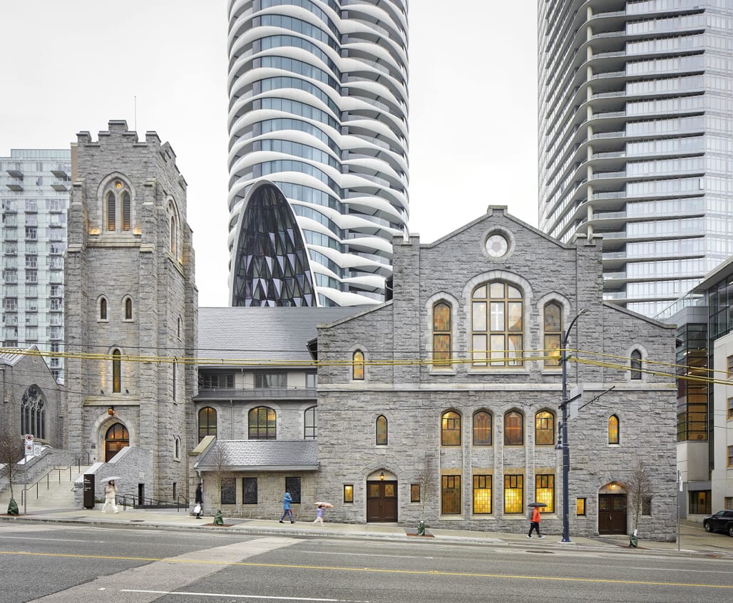 Revery Architecture has completed the Butterfly + First Baptist Church Complex, a 605,000-square-foot mixed-use development in downtown Vancouver. Commissioned by Westbank Corp in partnership with the First Baptist Church of Vancouver, the scheme combines a 57-story residential tower, a mid-rise rental building with affordable housing, and the restoration and expansion of the First Baptist Church, a Gothic Revival landmark originally completed in 1911 and rebuilt following a 1931 fire. Archinect first reported on the scheme last year.