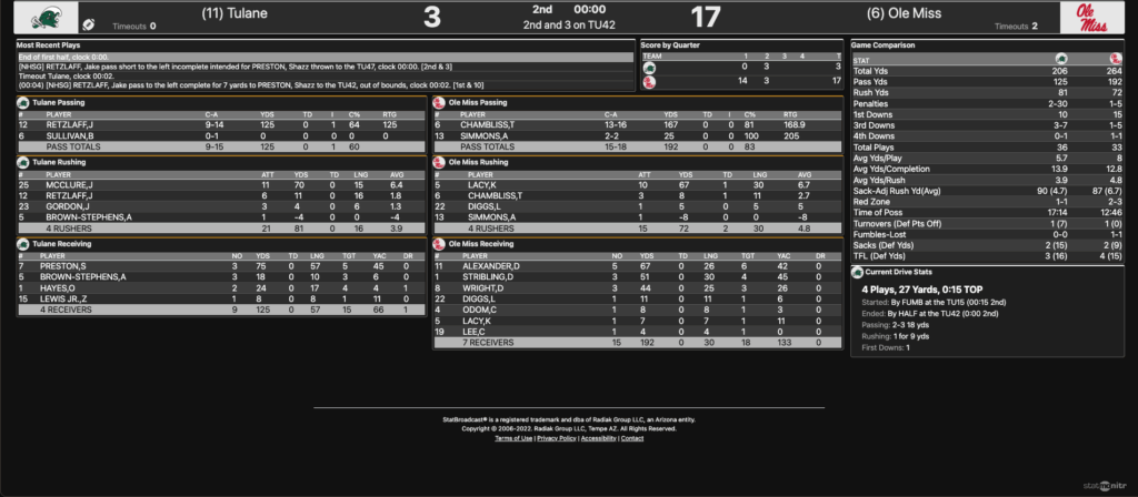 At halftime, Ole Miss held a 17-3 lead over Tulane. The Rebels totaled 264 yards of offense, led by 167 passing yards from Trinidad Chambliss, while the Green Wave had 206 total yards in the first half.