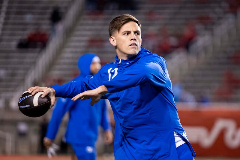 BYU quarterback Jake Retzlaff (12) warms up before a game between the University of Utah Utes and the BYU Cougars held at Rice-Eccles Stadium in Salt Lake City on Saturday, Nov. 9, 2024. | Isaac Hale, Deseret News