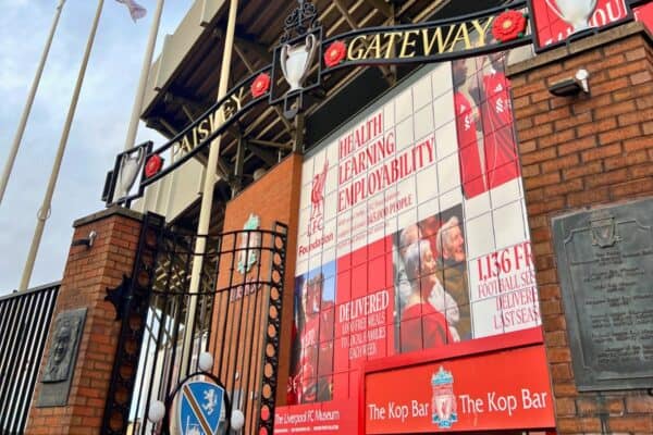 Where the club shop advertising usually sits, the Kop’s exterior now features messaging from the foundation in the hope it will raise awareness of their work to tackle social inequality.