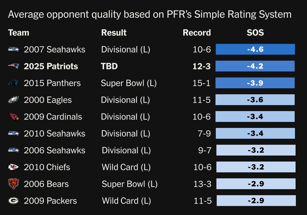 No Super Bowl winners on that list, but two appearances among their nine peers? Nothing to sniff at. And if we rewind to 1970, the nine other playoff-team schedules easier than these 2025 Patriots produced three Super Bowl winners (1999 Rams, 1970 Colts, 1972 Dolphins), per ESPN’s Bill Barnwell, plus another appearance (1991 Bills).