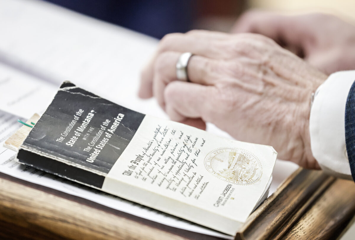 Rep. Tom Millett speaks to the House Judiciary Committee with his copy of the Montana and U.S. Constitutions on the podium at The Capitol in Helena on Jan. 16, 2025. Hunter D’Antuono | Flathead Beacon