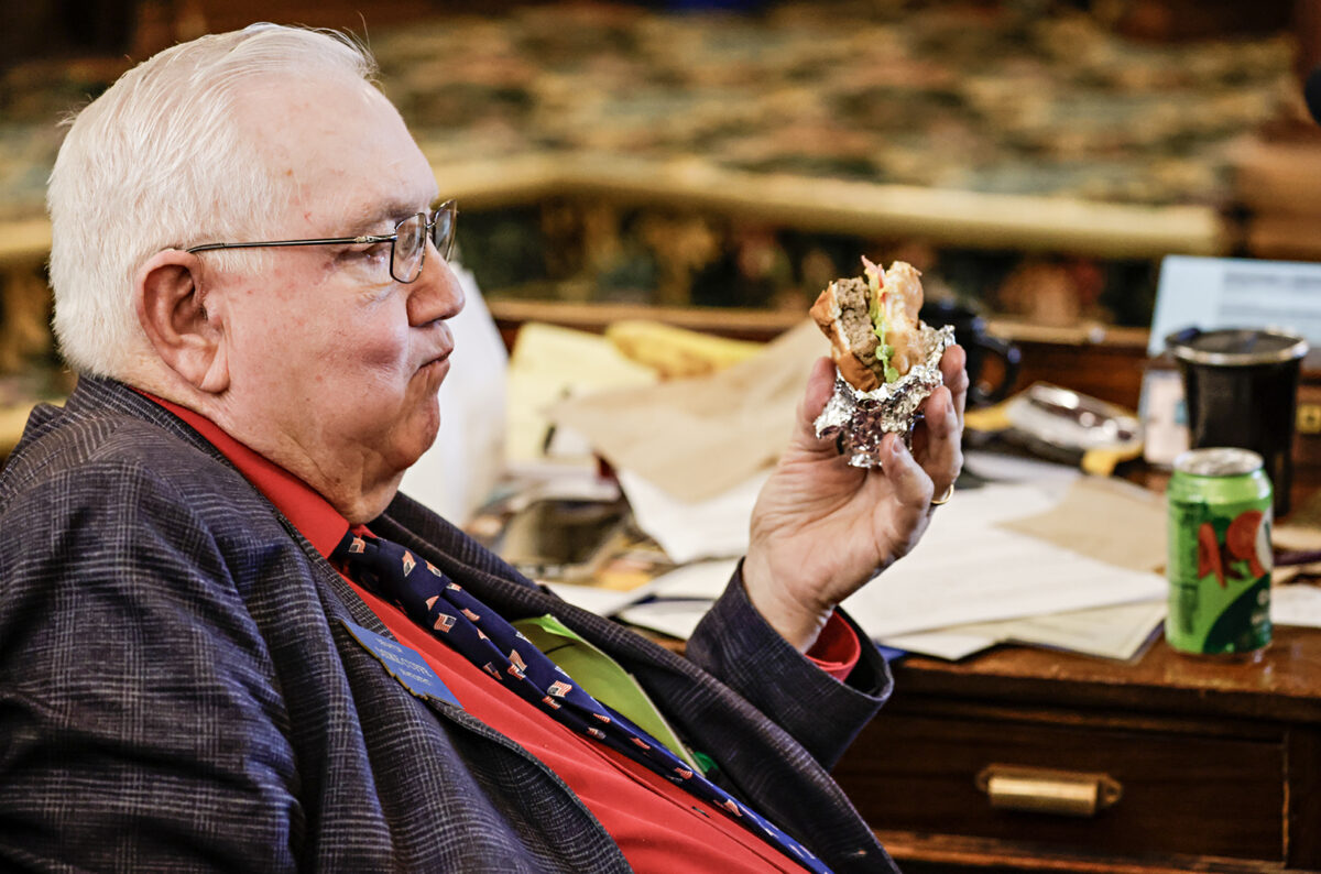 Sen. Mike Cuffe enjoys a burger in the Senate Chambers in the Capitol in Helena on Jan. 16, 2025. Hunter D’Antuono | Flathead Beacon