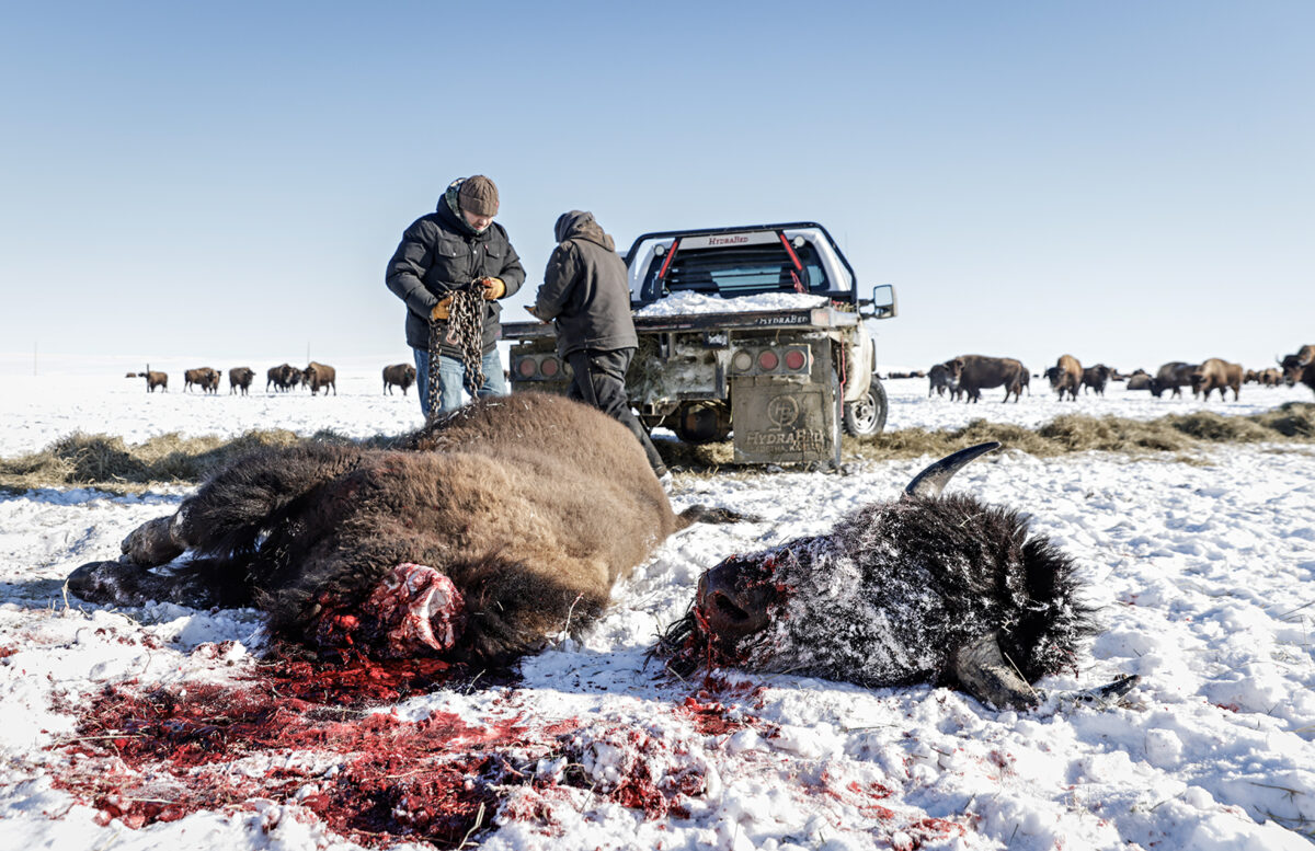 Bison caretakers Joe LaPlant and Adrian Costel prepare to load a harvested bison from the Blackfeet Bison Program herd onto a truck on the prairie east of Browning on Feb. 6, 2025. Hunter D’Antuono | Flathead Beacon