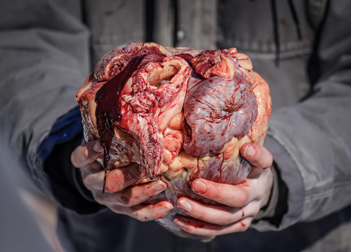 Eli Neill holds the heart of a bison during a Blackfeet Bison Program harvest at AMS Ranch east of Browning on Feb. 6, 2025. Hunter D’Antuono | Flathead Beacon