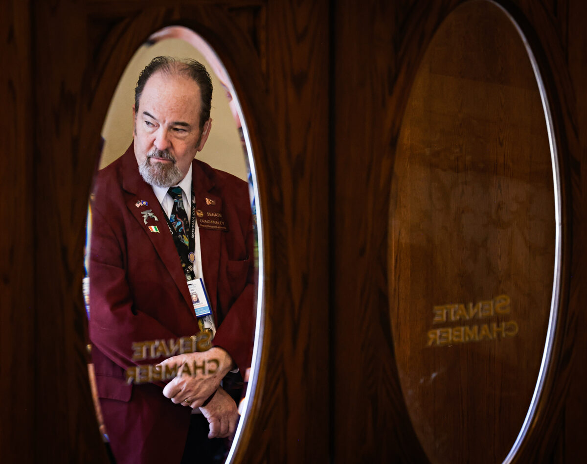 Deputy Sergeant-at-Arms Craig Fraley at his post outside the Senate Chambers in the Capitol in Helena on March 25, 2025. Hunter D’Antuono | Flathead Beacon