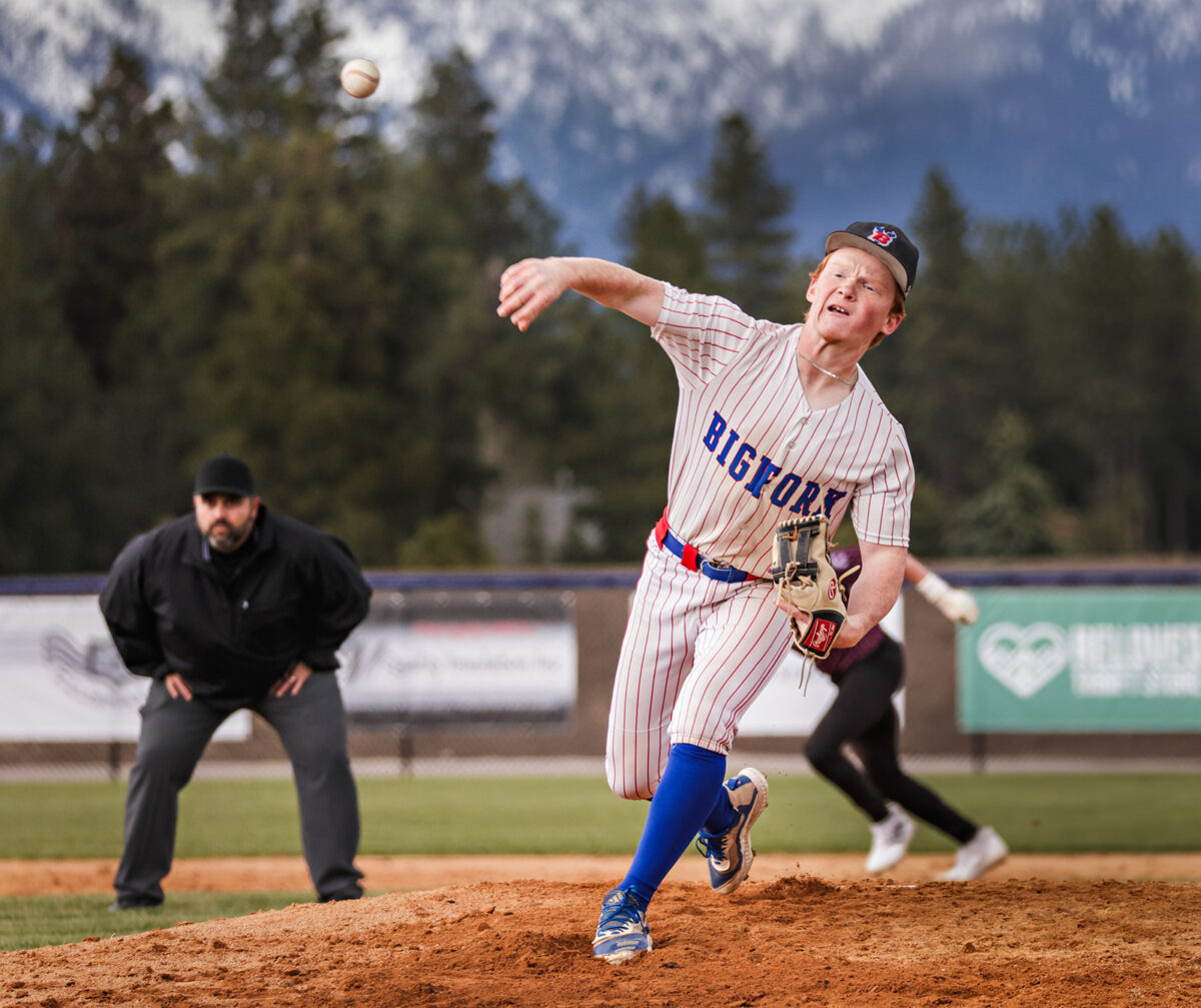 Liam Benson of the Bigfork Vikings pitches at the inaugural game at Flathead Beacon Field in Bigfork on April 17, 2025. Hunter D’Antuono | Flathead Beacon