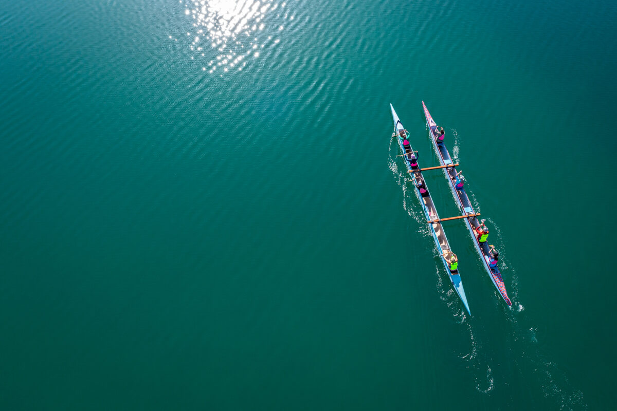 Paddlers with Montana Silver Lining and the Montana Canoe Club paddle a double hulled canoe on Flathead Lake in Big Arm on May 25, 2025. Hunter D’Antuono | Flathead Beacon