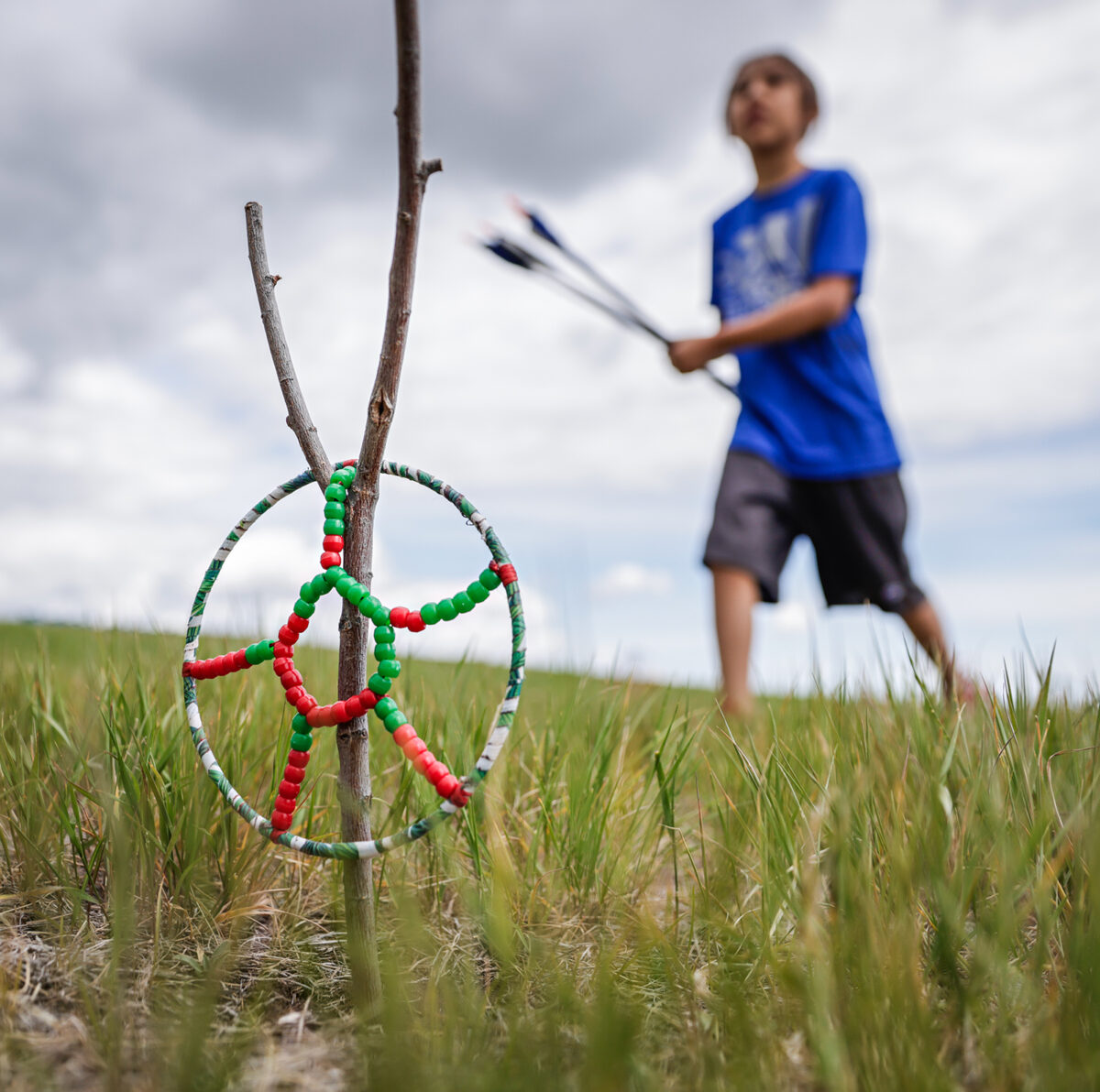 A young archer collects fired arrows from around beaded targets in a field at Iinnii Days in Browning on June 5, 2025. Hunter D’Antuono | Flathead Beacon