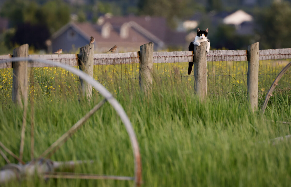 A cat and birds perched on a fenceline off of Four Mile Drive in Kalispell on June 25, 2025. Hunter D’Antuono | Flathead Beacon