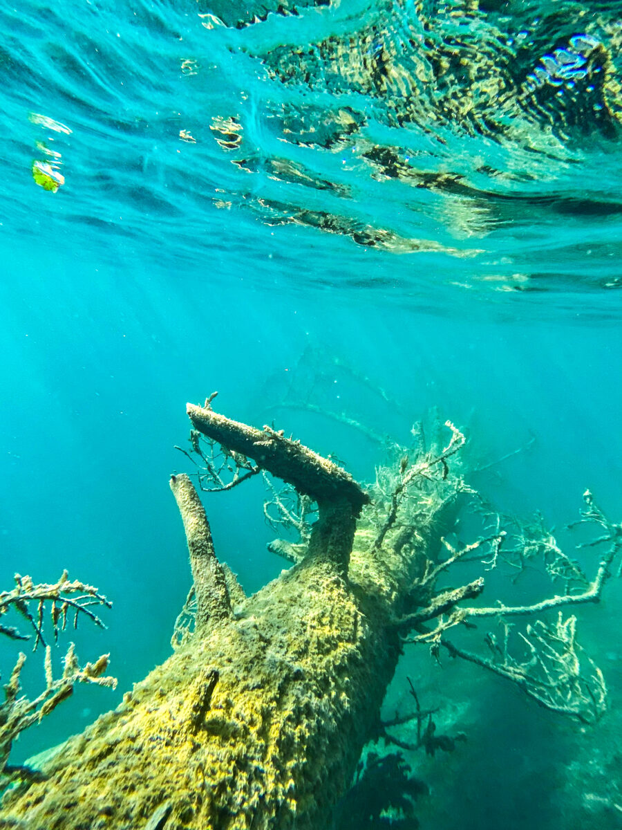 Underwater view of an old tree in Bowman Lake in Glacier National Park on July 9, 2025. Hunter D’Antuono | Flathead Beacon