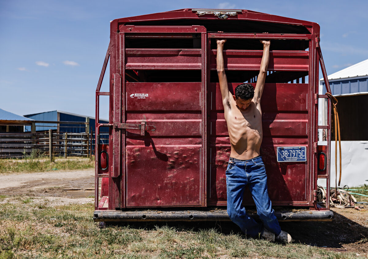 Indian Relay team member Devyn Campbell of the Blackfeet Nation stretches against a horse trailer ahead of the races at North American Indian Days in Browning on July 11, 2025. Hunter D’Antuono | Flathead Beacon