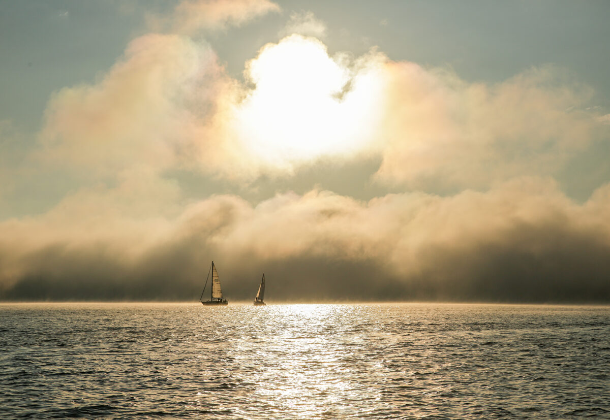 Boats take their positions at the Montana Cup sailing tournament at dawn on Flathead Lake on Aug. 3, 2025. The annual competition attracts dozens of sailing crews from around Montana and Idaho. Hunter D’Antuono | Flathead Beacon