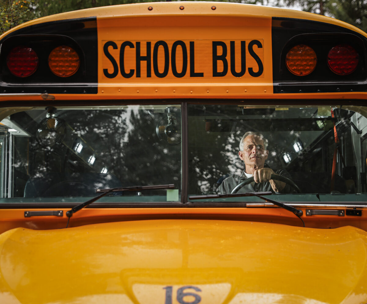 Contract school bus driver Gerard Byrd at the wheel of one of his buses at his home in Martin City on Aug. 28, 2025. Gerard ferried students throughout the Canyon for 42 years, driving a total of some 1.2 million miles on some the worst roads in Montana. Hunter D’Antuono | Flathead Beacon