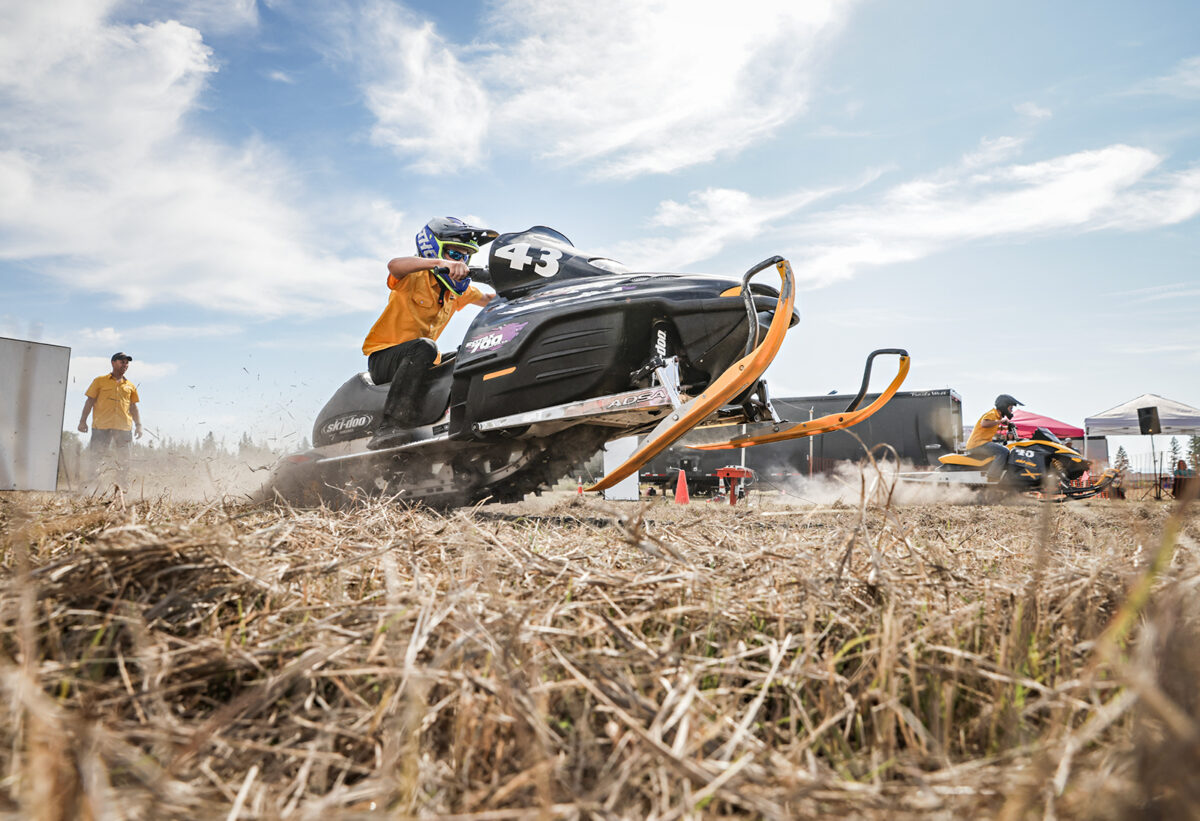 Racers speed away from the starting line at the Keller Ranch Snowmobile Grass Drags in Kalispell on Sept. 20, 2025. Hunter D’Antuono | Flathead Beacon