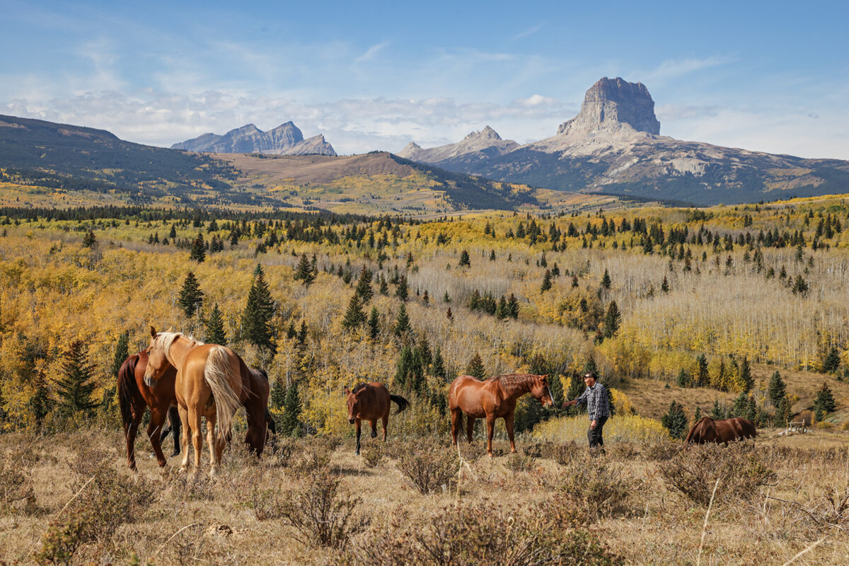 A man approaches a herd of horses grazing in view of Chief Mountain near Babb on Sept. 29, 2025. Hunter D’Antuono | Flathead Beacon